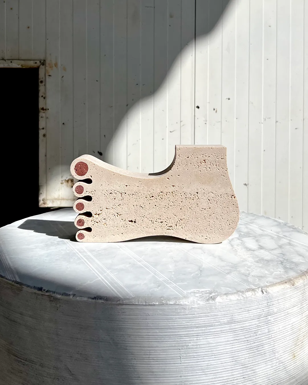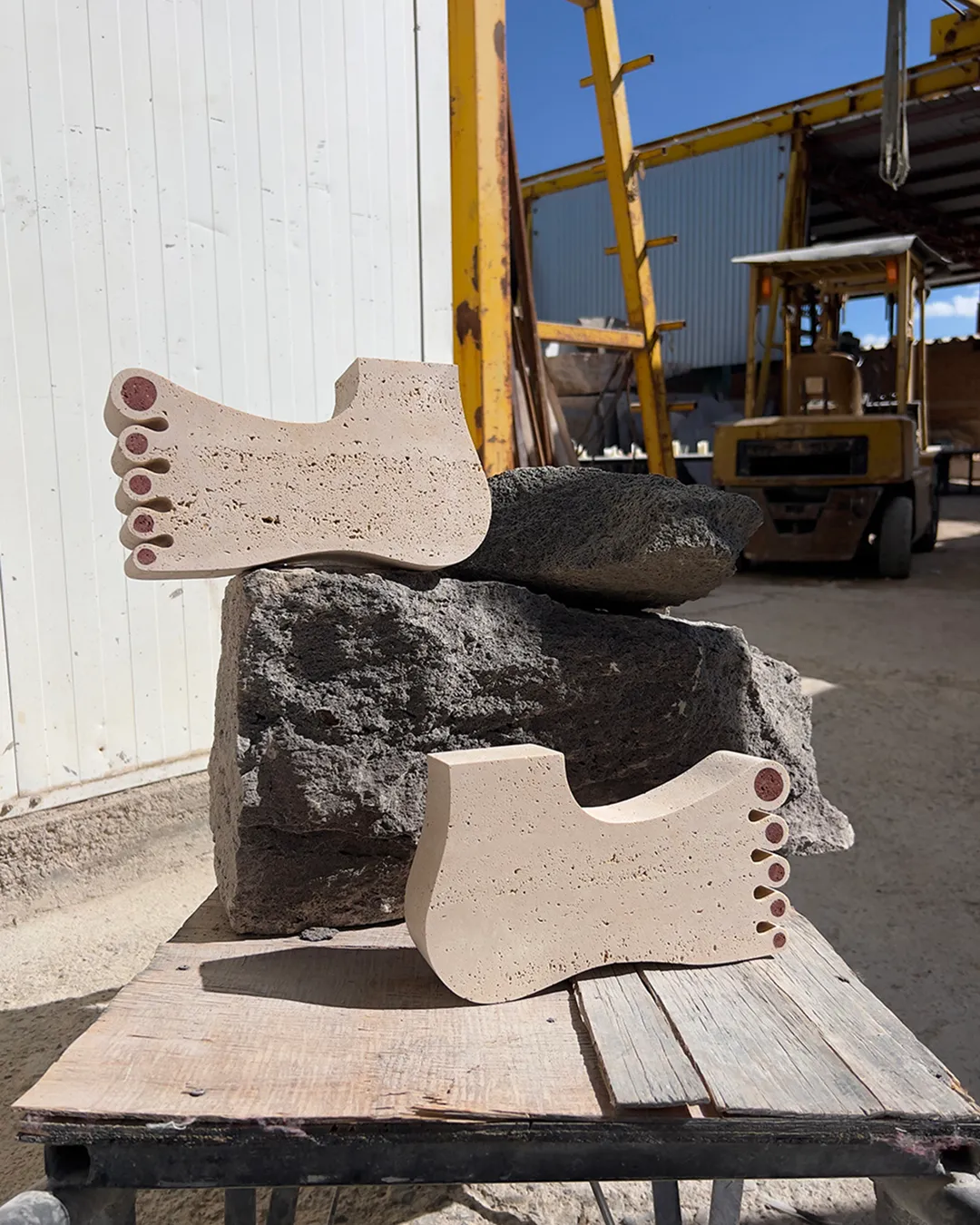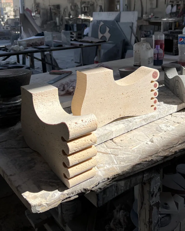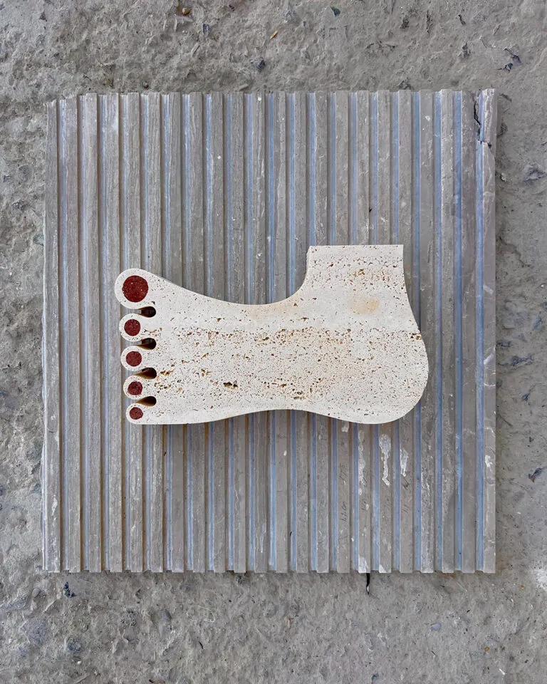 “El pied de Michelangelo”, 1 of 3 projects created during “Transformando la piedra” in Guadalajara, Mexico at Marmoles Covarrubias. Travertino and red volcanic stone 27 x 15 x 6cm.